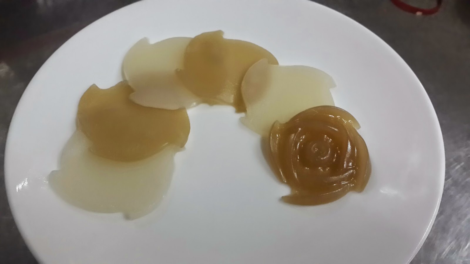 8. เมื่อขนมสุกดีแล้วให้ทิ้งไว้จนเย็น เซ็ตตัวก่อนค่อยตัดเป็นชิ้นๆค่ะ หรือจะลอกเป็นชั้นบางๆ พับเป็นดอกไม้ก็ได้ค่ะ แต่ตาไม่มีฝีมือ เล่นหยอดใส่พิมพ์ถาดกับพิมพ์ซิลิโคนแทน 55